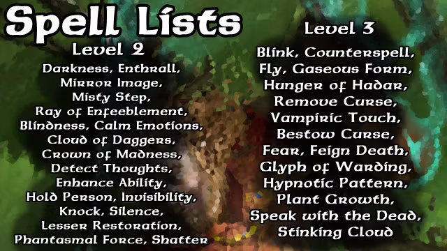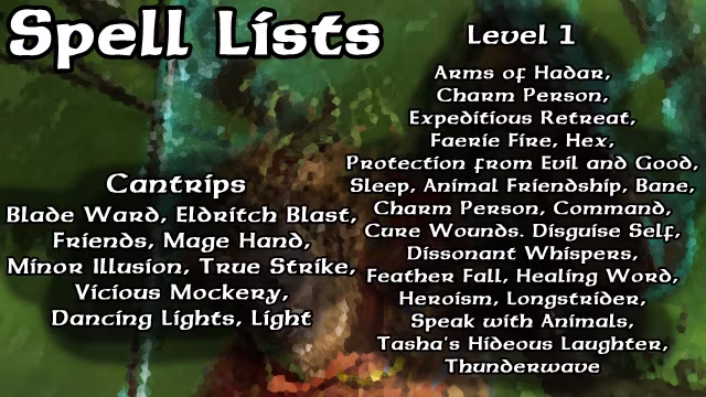 1级法术: 黑暗触须、魅惑人类、快速移动、精灵火、诅咒、防善除恶、睡眠、动物友谊、邪恶光环、魅惑人类、命令、治愈伤口。伪装术、不和谐低语、轻灵落体、治疗之言、英勇术、长足步、与动物交谈、塔莎的可怖笑声、震耳欲聋