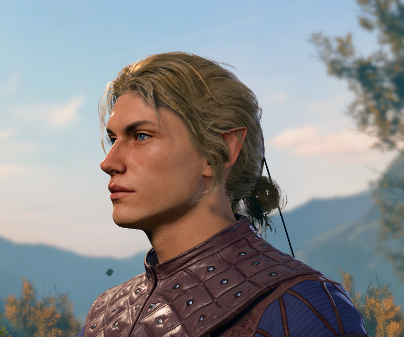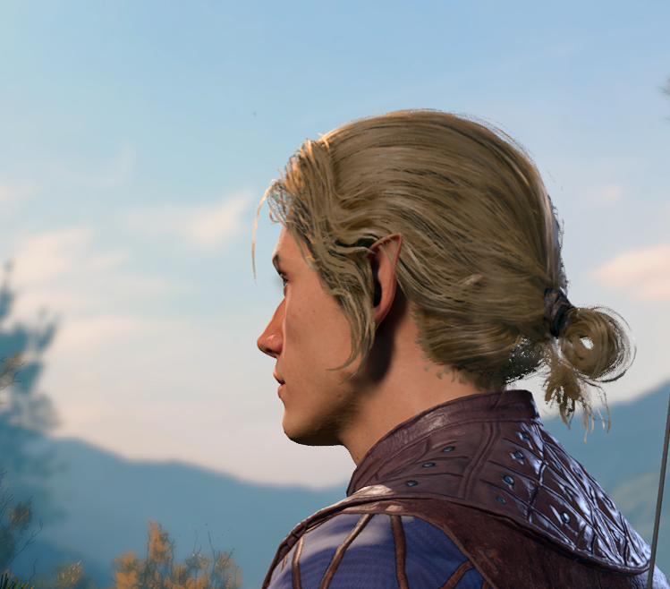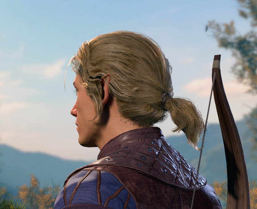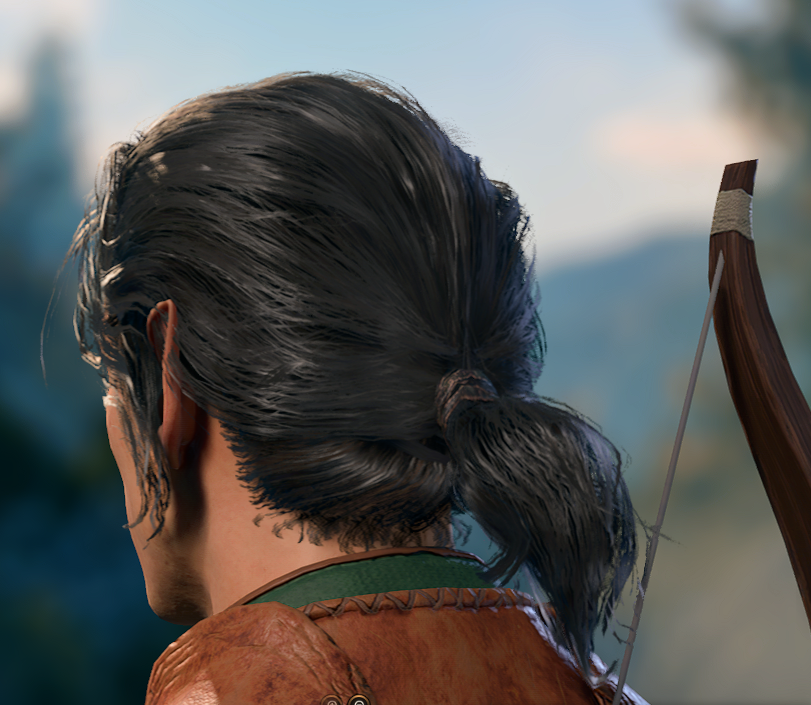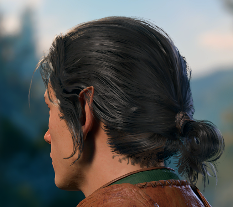 这款发型包括一个低马尾辫和一个低发髻,并带有物理效果,给人一种不修边幅的感觉,使其看起来更加粗犷或像一名盗贼。