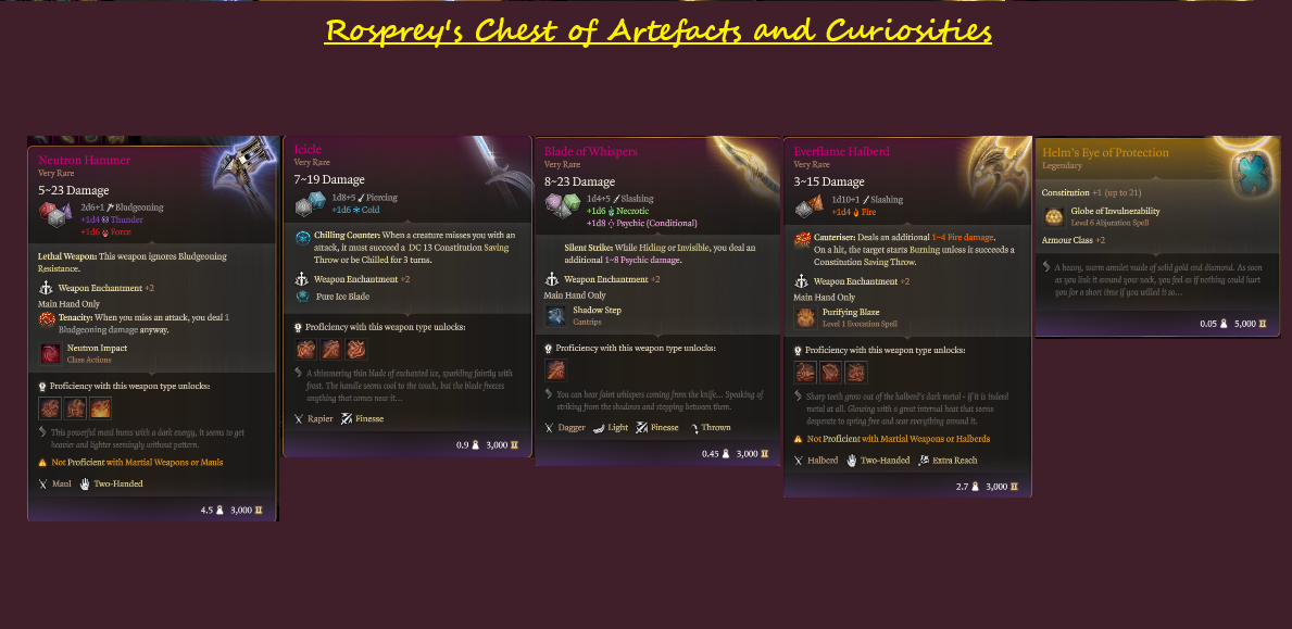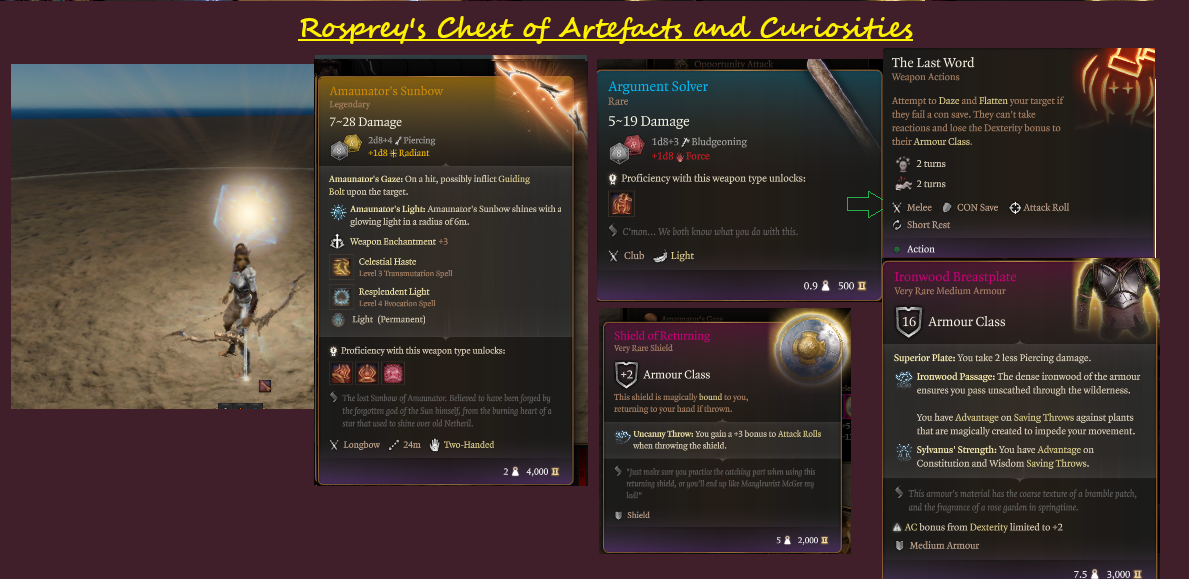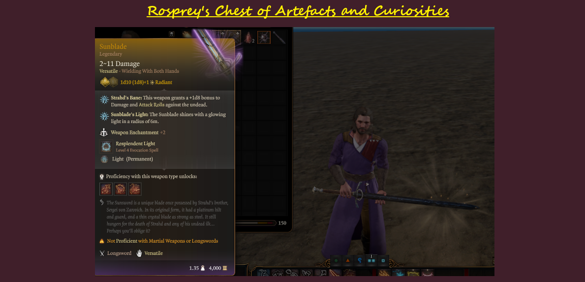 - 日光剑(长剑)- 对不死生物有效。标准攻击造成2到11点辐射伤害,并允许施放“白昼”法术。对不死生物的攻击和伤害掷骰额外增加1d8。
