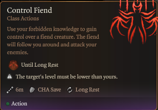 - 控制邪魔:控制一个敌对的邪魔。它会跟随你并攻击你的敌人,直到下一个长休息。