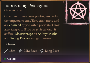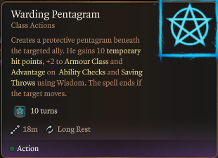 - 防护五角星:在目标盟友下方创造一个保护性的五角星。如果该盟友移动,此法术结束。激活时,目标获得: