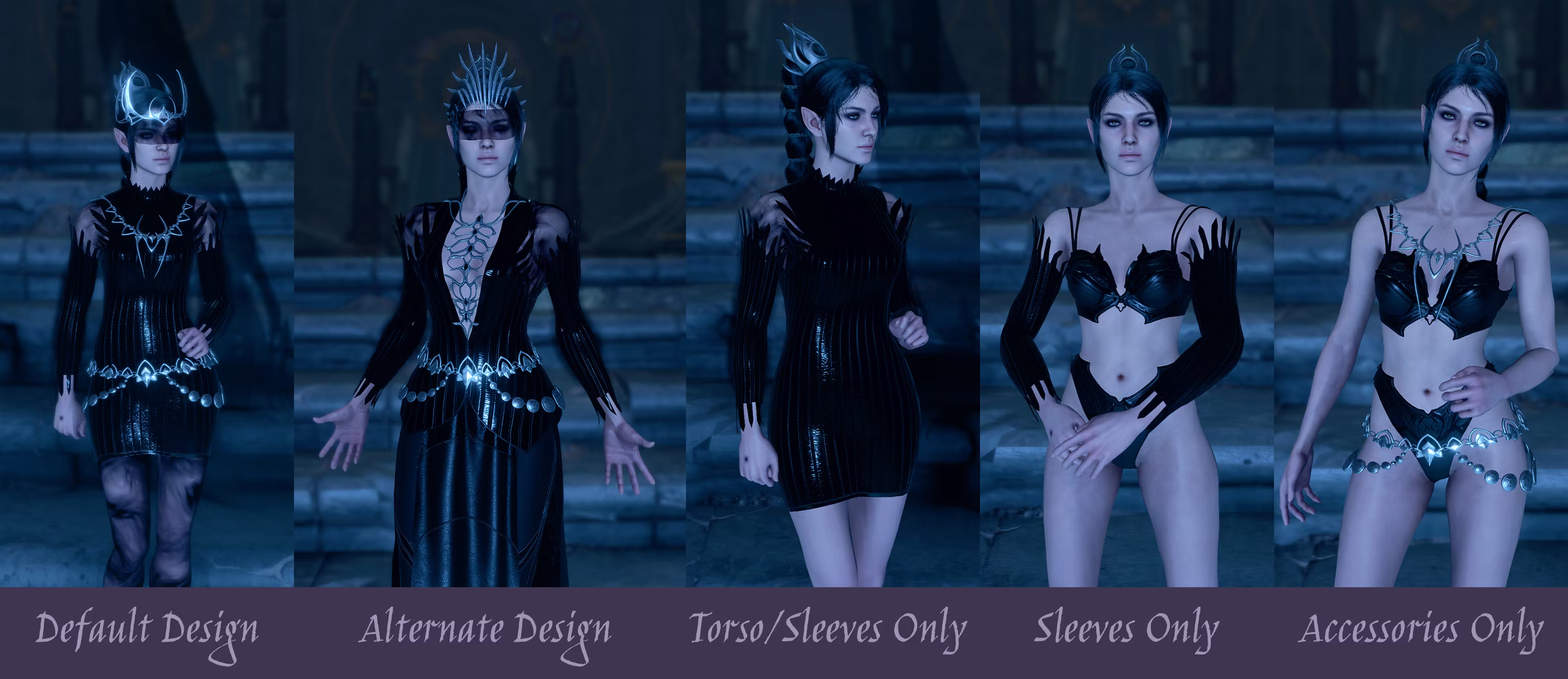 此套装仅适用于 BT1/2 的人类、精灵、杜垩登人和 Tiefling。它也可以装备在 Githyanki 和 Illithids 上,但并不完全贴合。