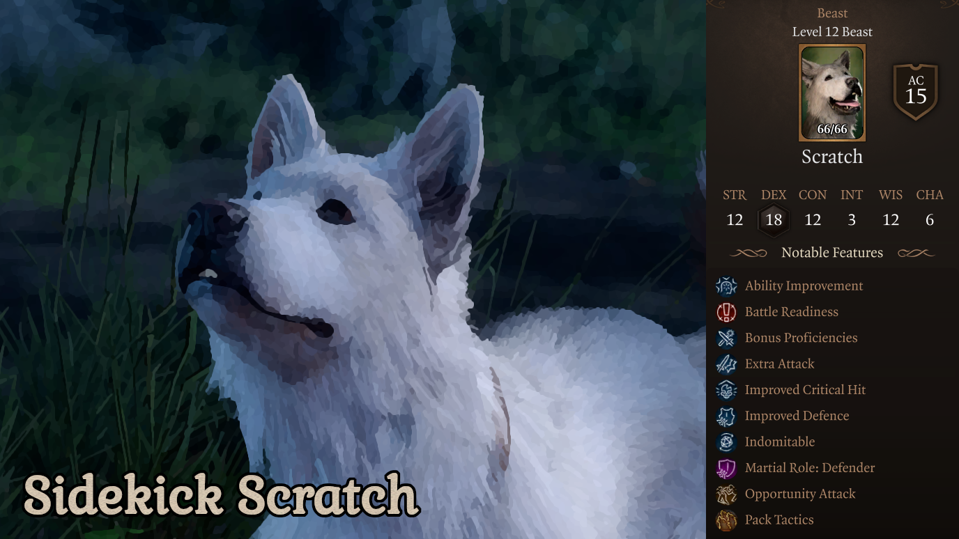Scratch 的能力将根据召唤者的等级进行调整,使用《Tasha’s Cauldron of Everything》中的战士随从类。这应该会使他在游戏后期更容易生存,并略微增加他的伤害和实用性。当被击倒时,Scratch 将会进行死亡豁免掷骰而不是立即消失。除了以下列出的功能外,Scratch 每升一级将获得 5-6 点生命值。