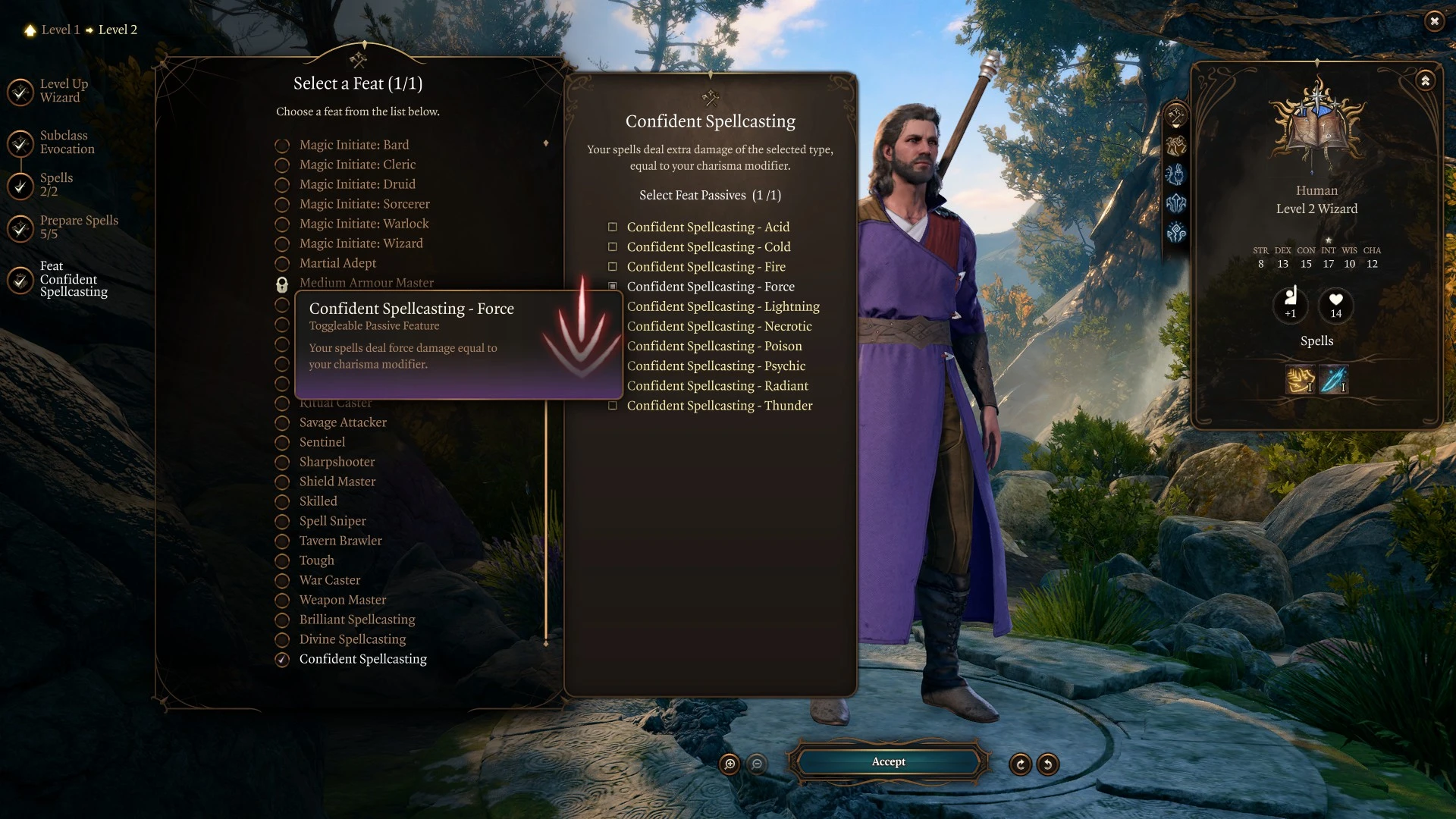 向游戏中添加了三个专长:卓越施法、神恩施法 和 自信施法。每个专长都提供一个可切换的被动效果,根据角色的能力值(分别为智力、感知和魅力)为所有法术伤害增加额外的选定类型伤害。