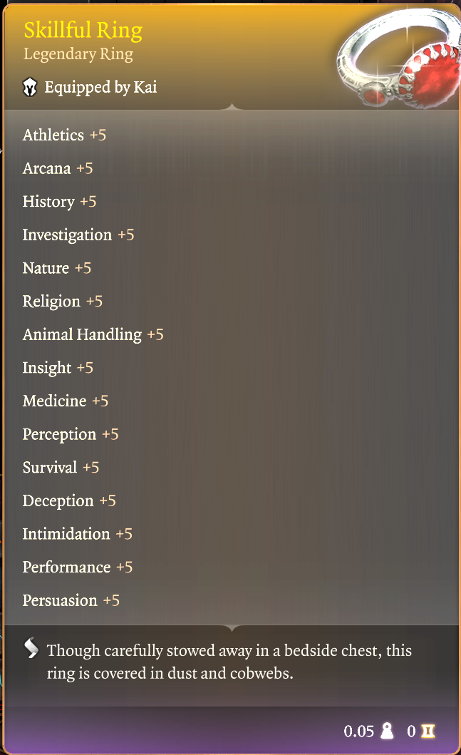 这是一款增加所有技能+5的戒指,但不包括潜行和灵巧(因为我为这两个技能制作了另一个模组)。该戒指存放在教程箱子中。