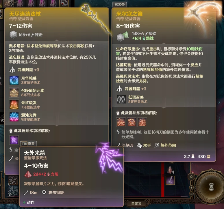 3、Myrkul Scythe and Watcher Greatswords resized,米尔寇之镰和微缩版钢铁卫士巨剑:该模组添加了4把在原版剧情中玩家无法使用的改版武器——米尔寇之镰、超级钢铁卫士巨剑、第一滴血耐色石镶嵌匕首和星界银剑,效果和技能基本遵循原版;