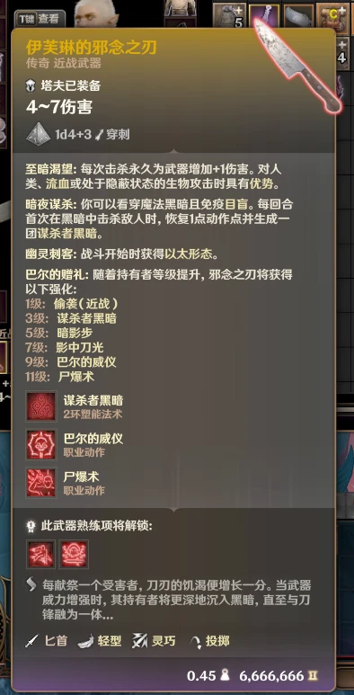 7、Evelyn’s DarkUrge Knife,Evelyn的邪念之刃:该模组添加了一把拥有独特技能的依据角色等级逐渐解锁新技能的匕首,你每用这把刀击杀一个目标,武器伤害便会永久+1(最高+20)。并且新技能赋予了你不需要正面硬刚,可以选择在不破隐或者以太形态的状态下暗杀目标的能力。
