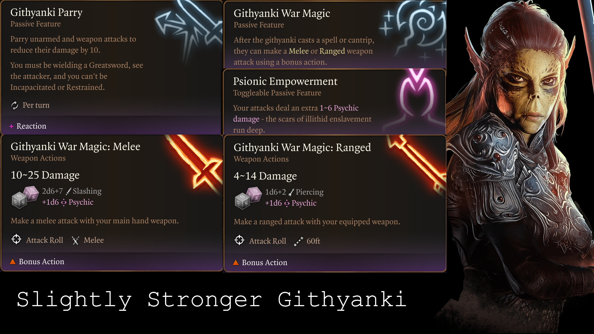 此简单模组为所有可玩的吉斯扬基角色增加了三个原本仅限 NPC 使用的独特被动技能,并将其整合到正常的角色成长过程中。这些被动技能在游戏中大多数吉斯扬基 NPC 中出现(其中一个在战术/荣誉难度下几乎所有 NPC 都有),现在我们的角色也可以使用它们,希望是平衡合理的。