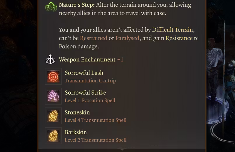 提供无需专注、作为附赠动作的树皮术(18点护甲)。