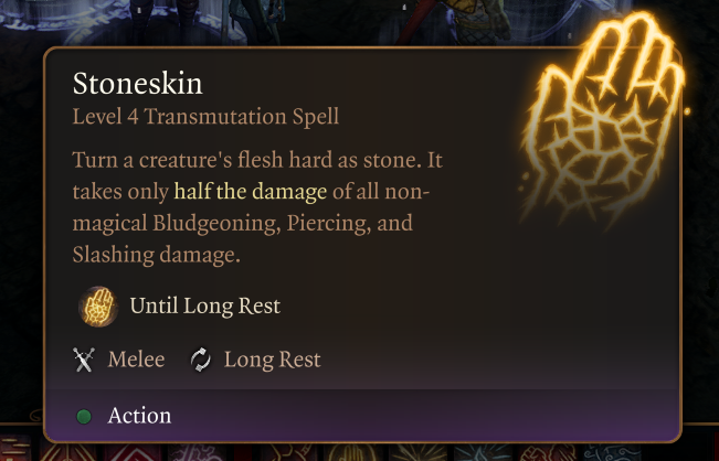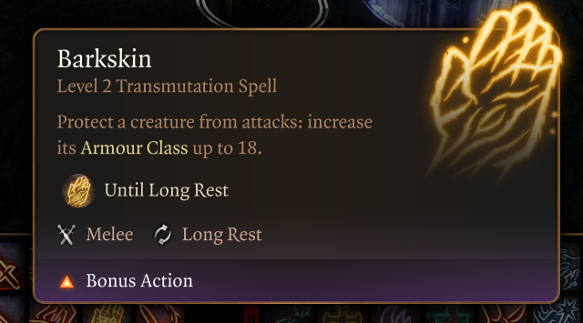 提供无需专注、作为附赠动作的树皮术(18点护甲)。