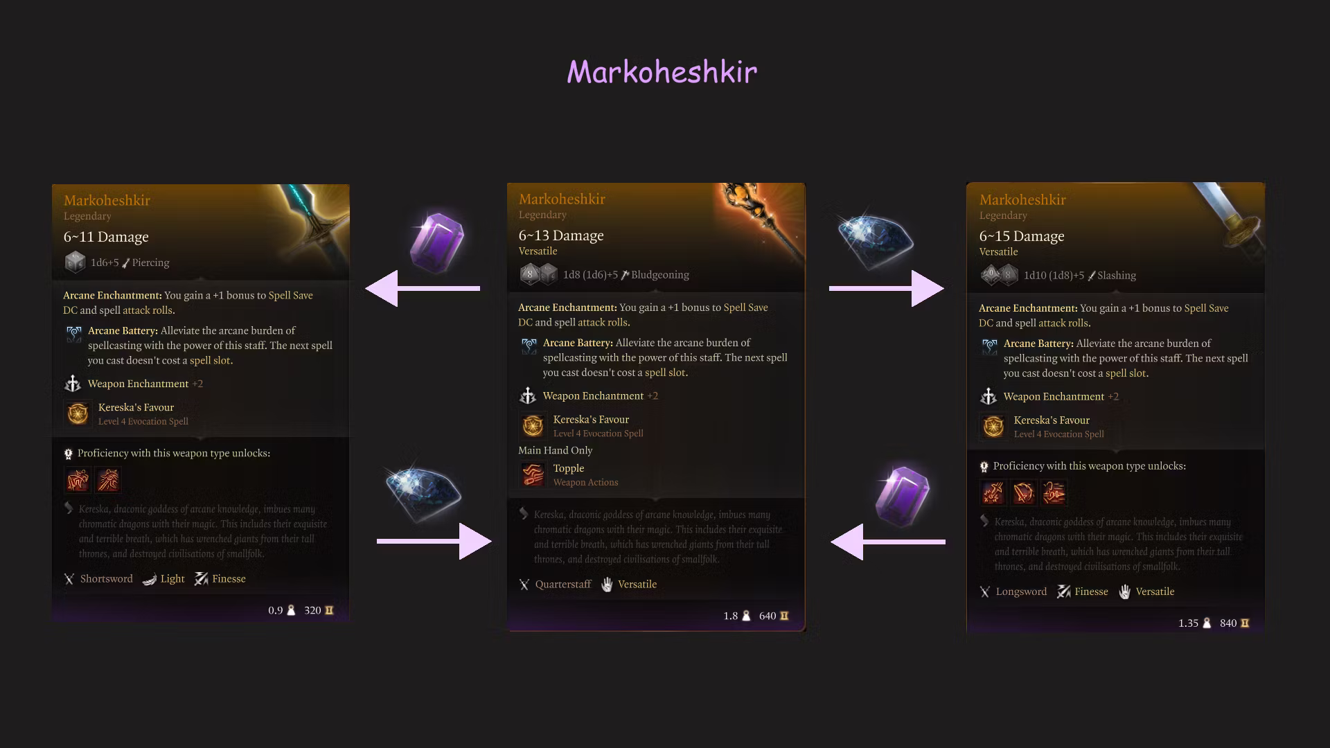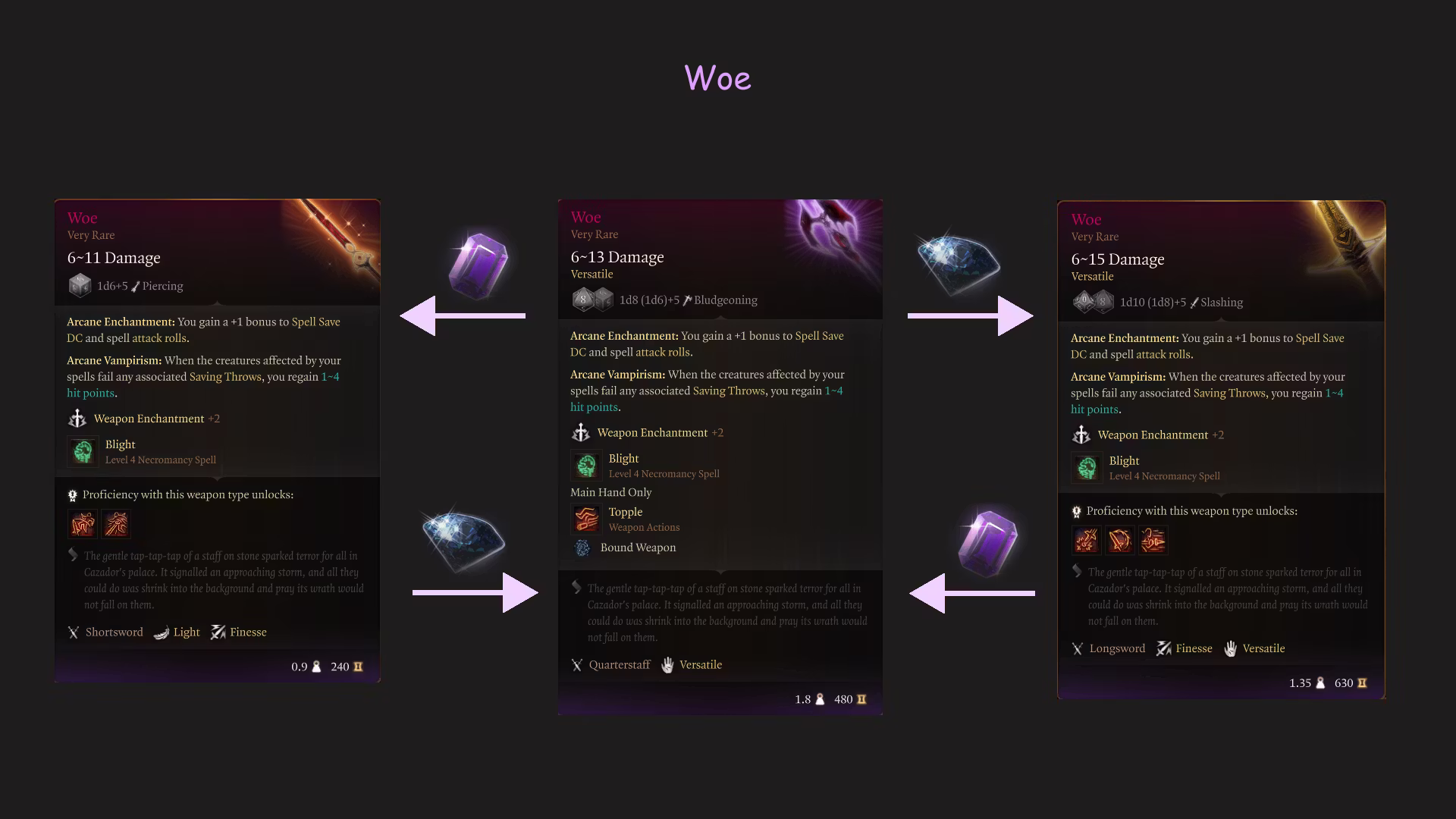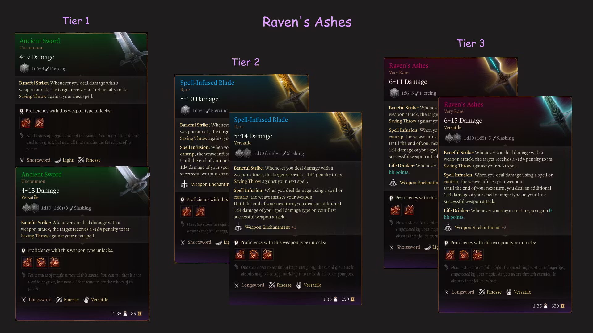 所有的剑都提供一种精通长剑版本(非常适合像圣骑士和EK这样的重击者,并且可以适用于敏捷或力量构建)以及短剑版本(适合双持、诡术师、吟游诗人以及其他希望武器随敏捷成长的施法者)。