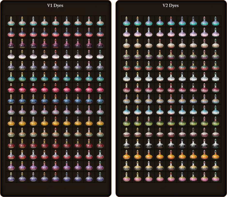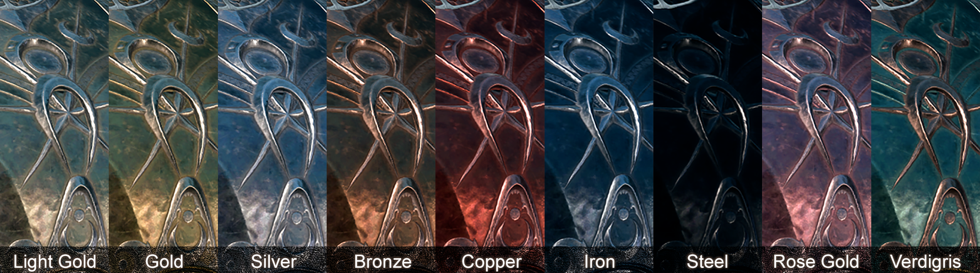 此包包含 30 种染料。每种染料有 9 种不同的金属版本:浅金、黄金、银色、青铜、铜、铁、钢、玫瑰金和绿锈。