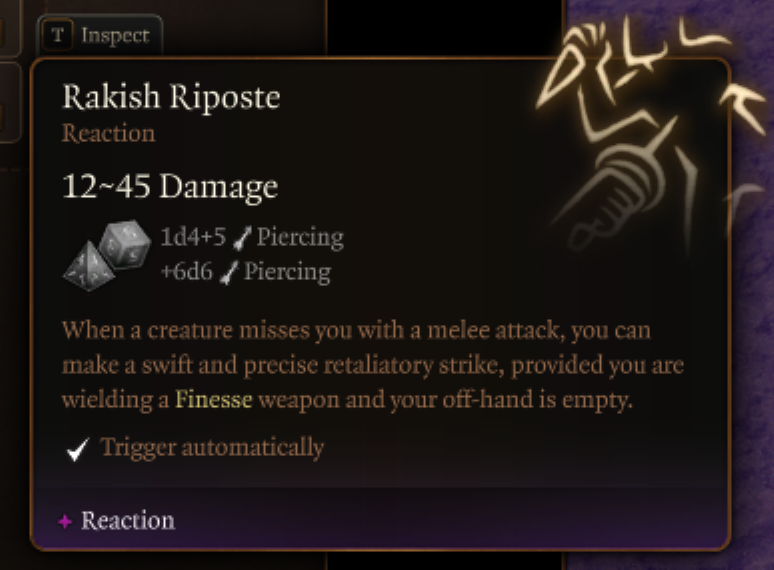 此模组为海盗剑客在等级5时添加了技能“潇洒反击”。该技能类似于战士大师副职的同名动作,但可以无限使用,并且其伤害基于你的潜行攻击骰子,因此随着盗贼等级的提高而增加。