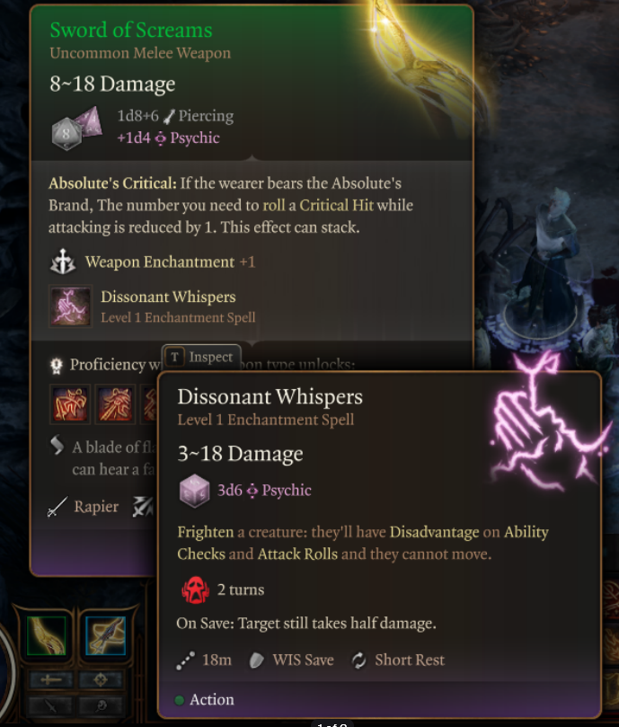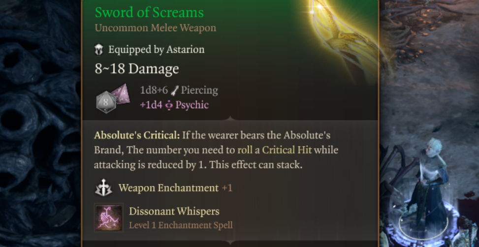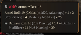在图片中可以看到测试时战斗日志的一段截图。攻击命中 19 导致暴击。Astarion 拥有“烙印”标记,并未使用其他装备来降低暴击阈值。
