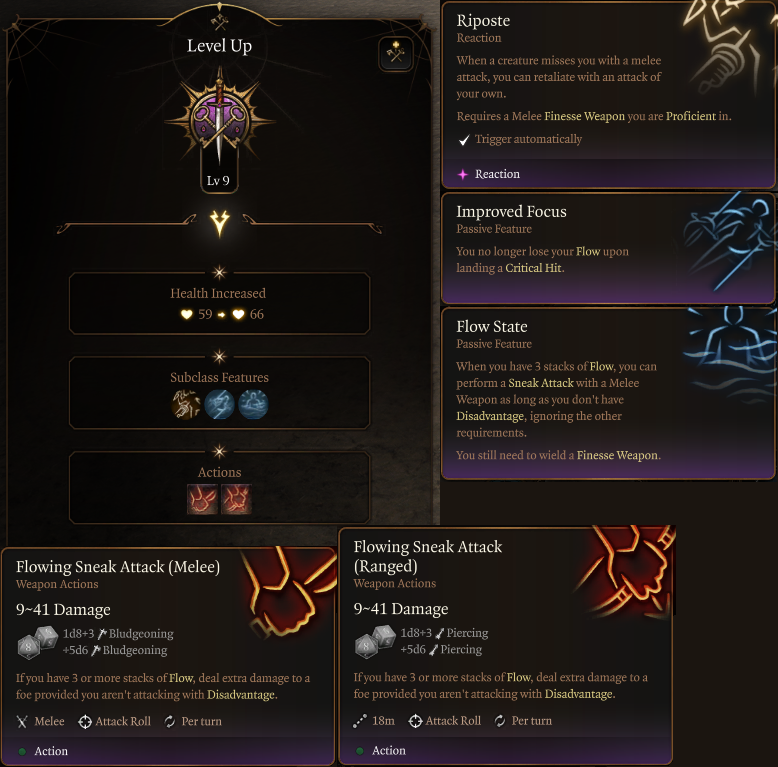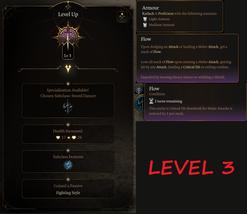 在 3 级时,你学会了阅读战斗的“流”并利用它来完成致命一击。只要你不被命中或未发动攻击,则每躲避一次攻击或使用近战武器进行一次打击都会获得一层“流”,直到战斗结束为止。