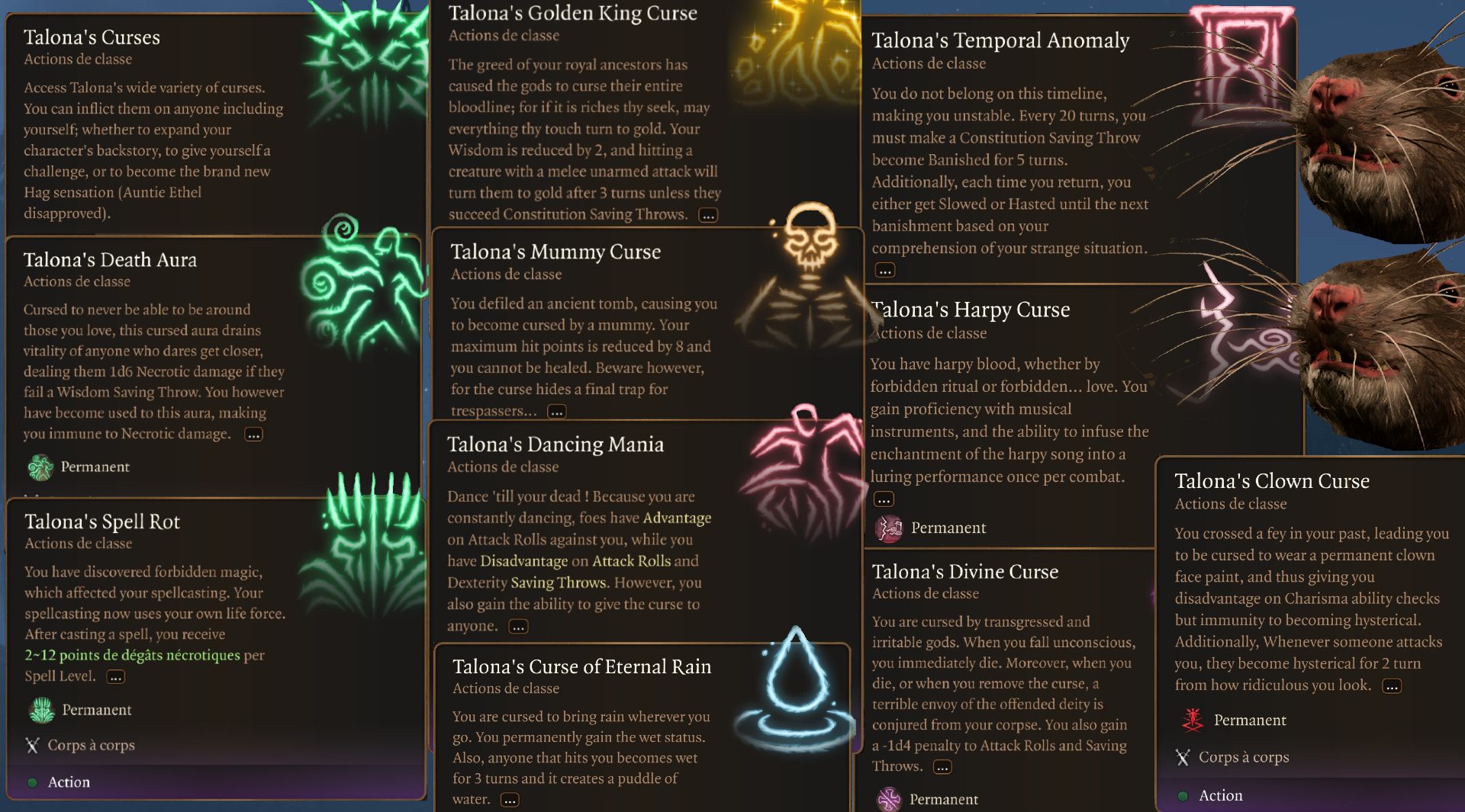 - 塔洛娜的失语症: 你永久失去说话能力。无法施放需要语言成分的法术,也无法进行对话(我移除了雷鸣免疫,因为它在这里没有意义)。
