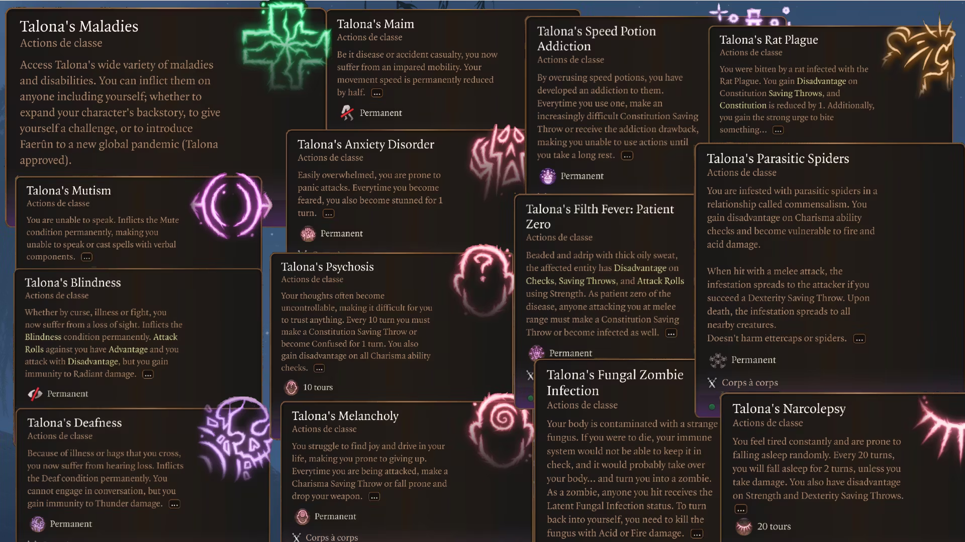 塔洛娜的诅咒与疾病添加了一根法杖,你可以在教程箱或营地箱中找到它。这根法杖允许你在自己或其他人身上施加塔洛娜的伟大诅咒和疾病。我最初打算只为《博德之门3》增加一些残疾效果,但最终共有18种疾病和10种诅咒可供实验。