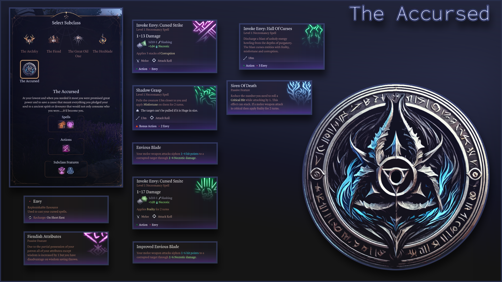 - 诅咒打击:武器攻击。造成近战武器伤害+1d4阴冷伤害,并在3回合内对目标施加腐败诅咒。如果目标已经受到腐败影响,该效果将延长3个回合。消耗1点嫉妒充能。