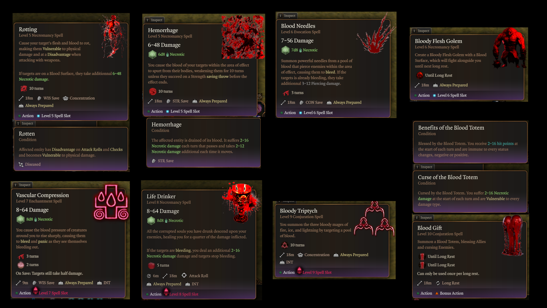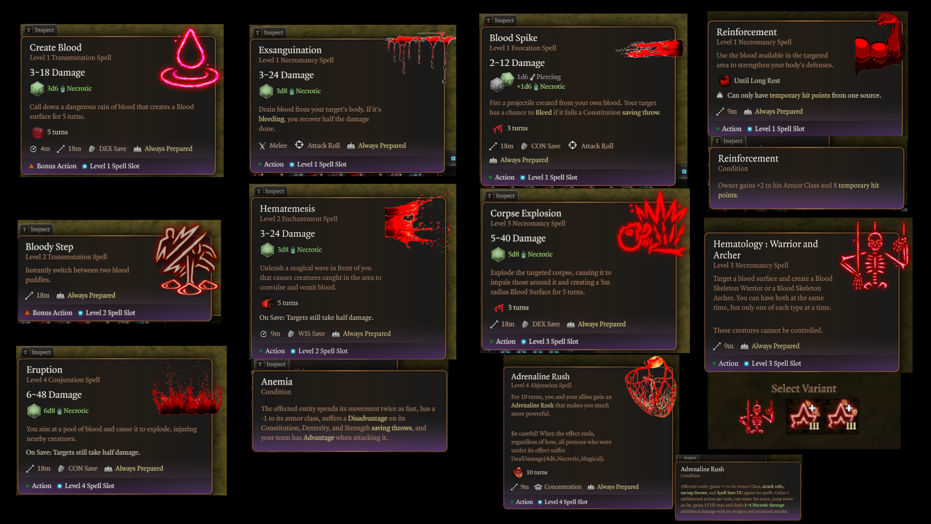 法术:创造血液,失血,强化,血刺,血腥步,吐血,血学(战士和弓箭手),尸体爆炸,爆发,肾上腺素激增,出血,腐烂,血腥肉傀儡,血管压缩,吸血鬼,血腥三联。