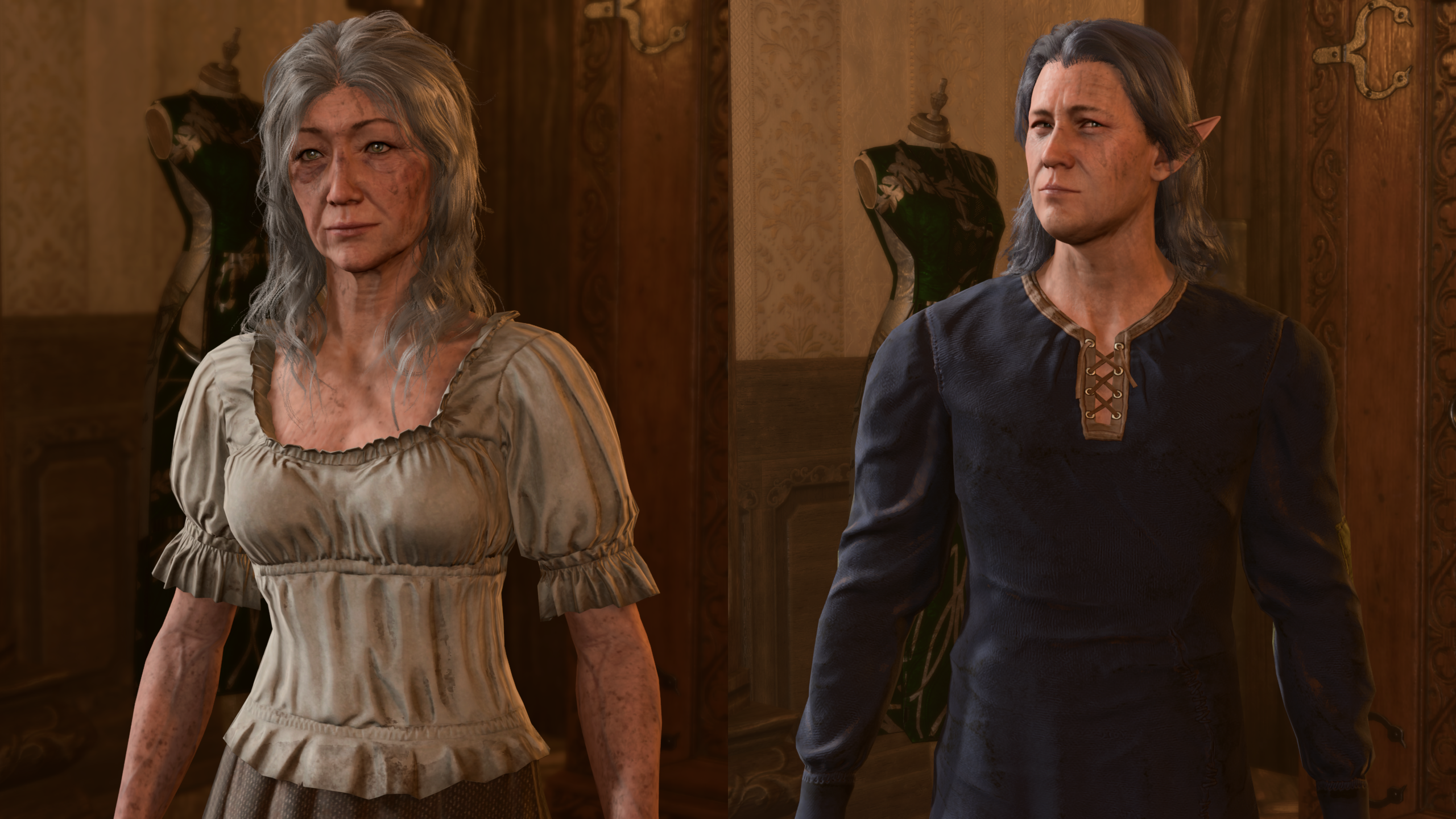 阿纳尔和艾梅琳·霍洛利夫在游戏中没有换装,所以我尝试给他们一些起码的尊严。他们的衣服仍然老旧且磨损,但不再是脏兮兮的破布。改动内容:幽暗之心的父母有了新的服装,她的父亲还换了新发型。