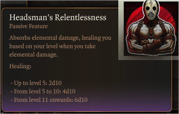 3. 刽子手的无情: 吸收元素伤害,在受到元素伤害时根据你的等级进行治疗。