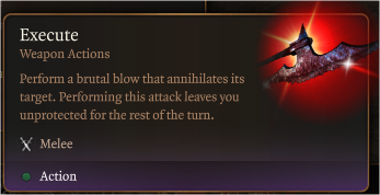 – 处决: 施展致命一击,消灭目标。使用此攻击后在剩余回合内将失去保护。