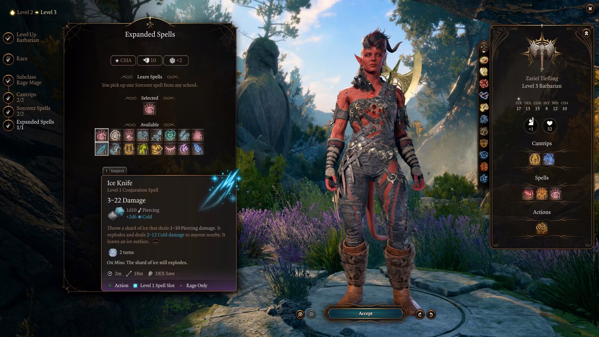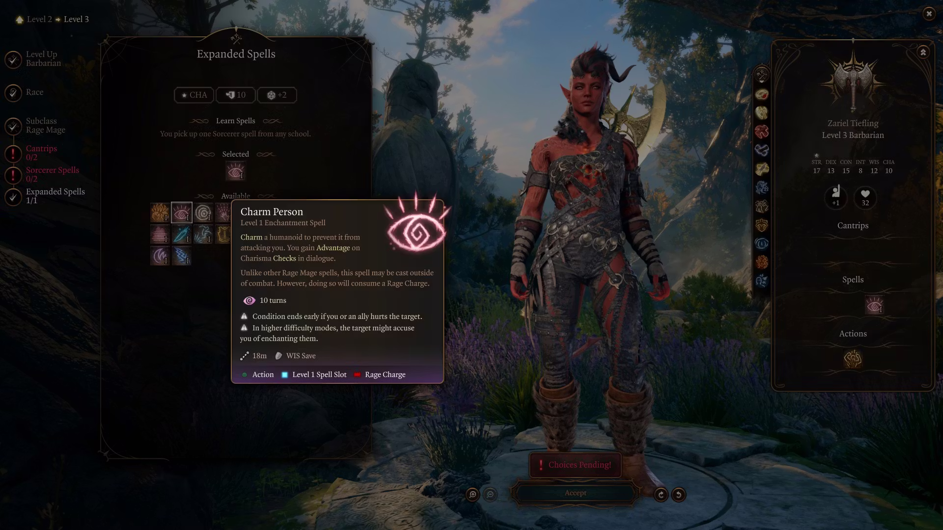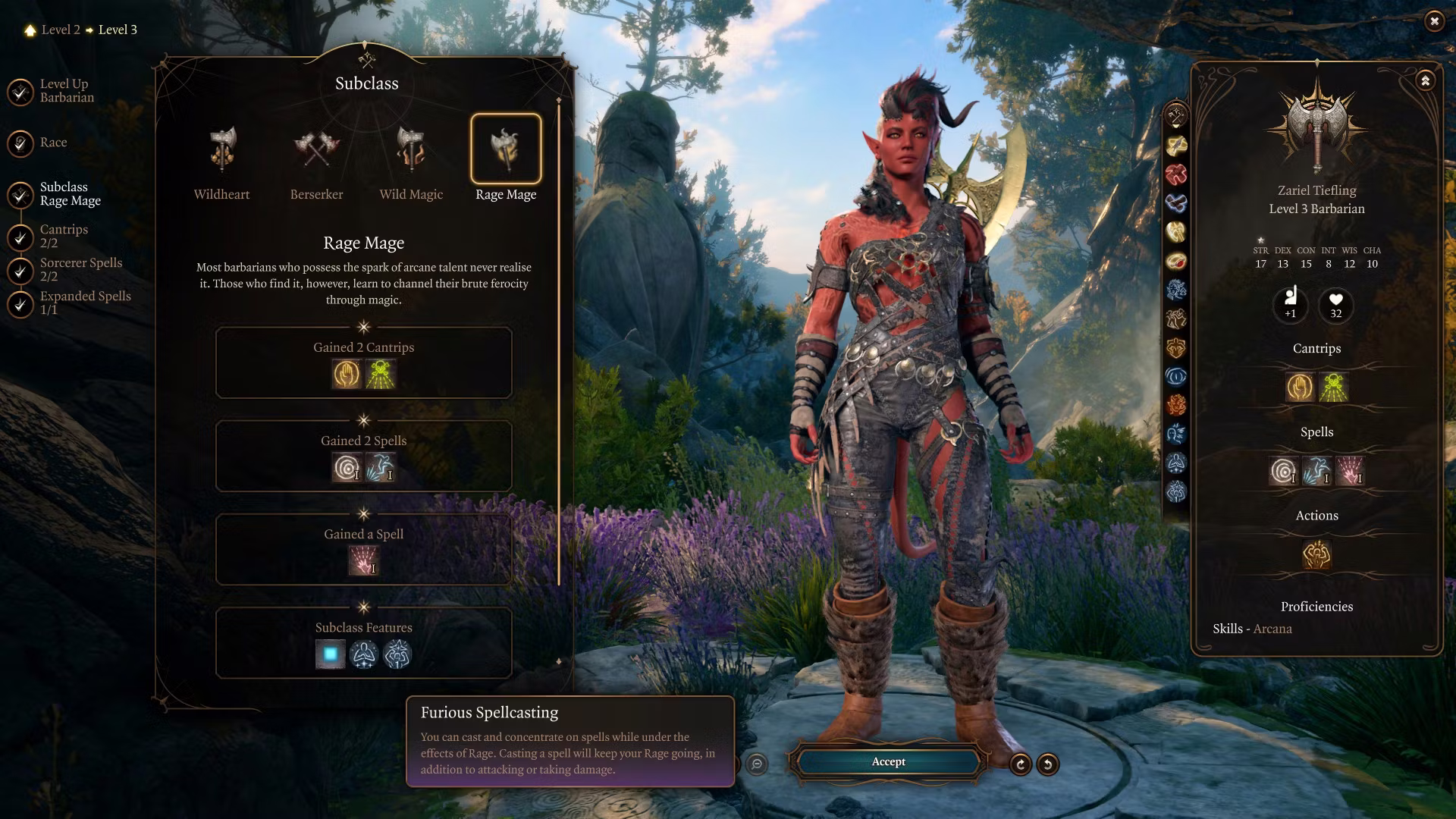 - 3级: 你可以在狂暴化时施放或集中法术,并且施放一个法术会保持你的狂暴状态。然而,通过这个副职学习到的所有法术仅在狂暴状态下才能使用。(你可以使用狂暴充能来激活某些实用法术,例如魅惑人类,在战斗外使用。)你获得的法术位与诡术士或魔战士相同。你的法术列表使用术士法术。