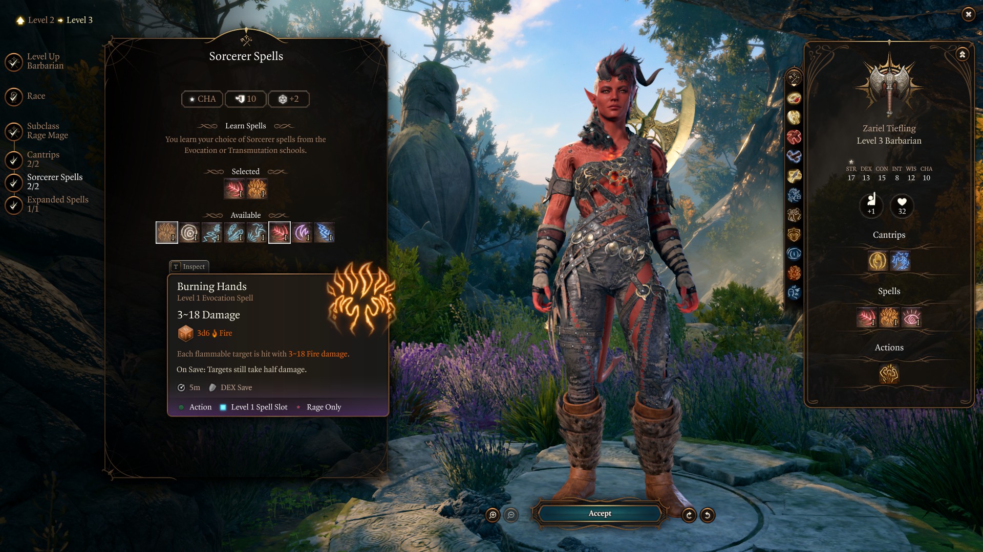 - 3级: 你可以在狂暴化时施放或集中法术,并且施放一个法术会保持你的狂暴状态。然而,通过这个副职学习到的所有法术仅在狂暴状态下才能使用。(你可以使用狂暴充能来激活某些实用法术,例如魅惑人类,在战斗外使用。)你获得的法术位与诡术士或魔战士相同。你的法术列表使用术士法术。