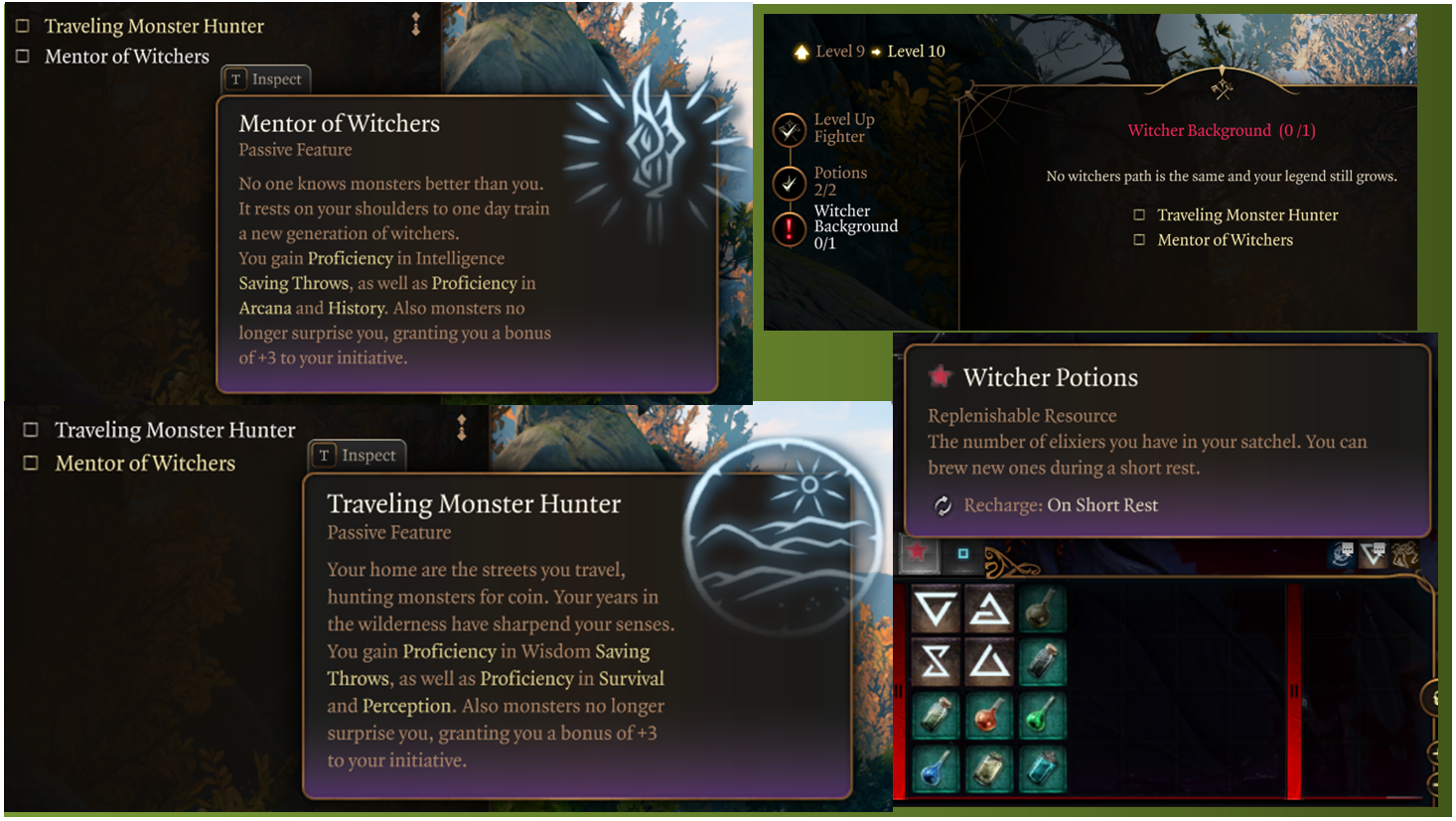 - 授予两种“巫师背景”之一:旅行怪物猎人 / 巫师导师