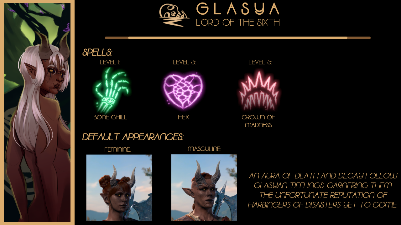 此模组添加了六个新的 Tiefling 子种族,代表九位深渊领主中的其余六位:Dispater、Mammon、Fierna、Levistus、Glasya 和 Baalzebul。