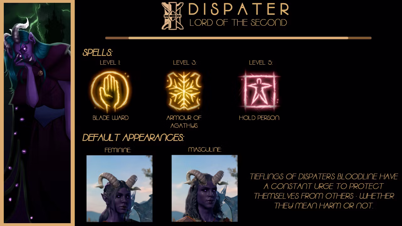 “Dispater 血统的 Tieflings 永远有保护自己不受他人伤害的冲动——无论对方是否真的想伤害他们。”