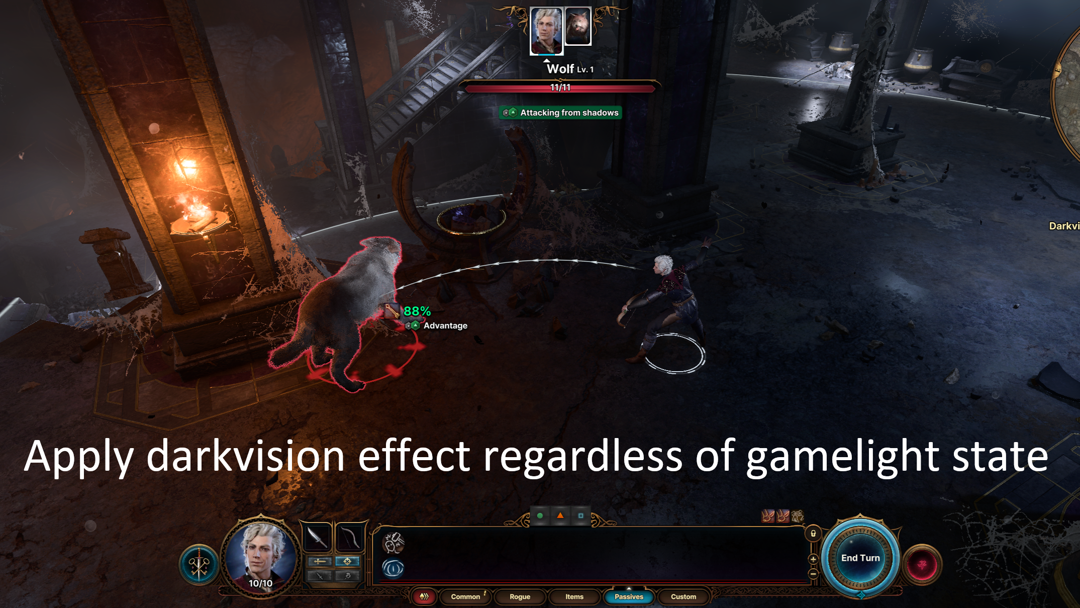 此模组为具有暗视能力的角色添加了一个可切换的被动技能,允许他们关闭通常从眼睛发出的“游戏光”。虽然在游戏中使用很方便,但这种游戏光在拍摄漂亮截图时可能会造成干扰。有了这个模组,你可以在不失去暗视全部效果的情况下禁用游戏光。
