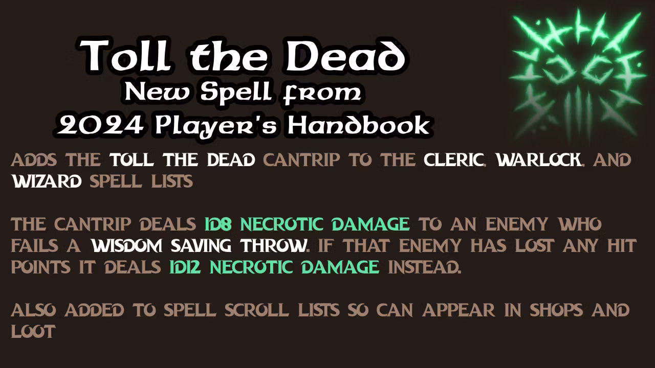 将 牧师、术士 和 法师 的法术列表中添加了“亡者之税”(Toll the Dead)法术,该法术源自2024年版的玩家手册。