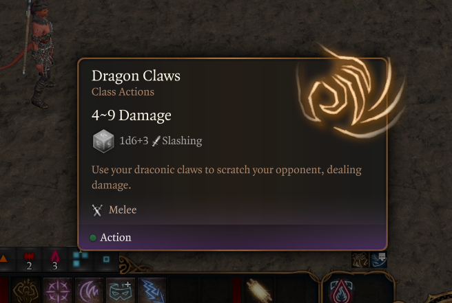 你获得龙爪。伤害值为 1d4+熟练加值+施法调整值,类型为挥砍,并且攻击视为近战法术攻击。(这些不是徒手攻击)