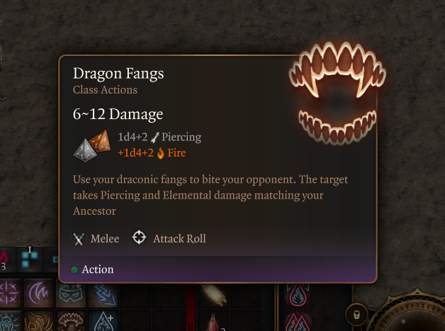 你获得龙牙。伤害值为 1d4 + 熟练加值穿刺+ 1d4 + 祖先的伤害类型。根据元素类型,施加不同的状态效果:灼烧、电击、冰霜覆盖、酸液和中毒。在第5级和第9级时,每种类型的伤害增加1d4。