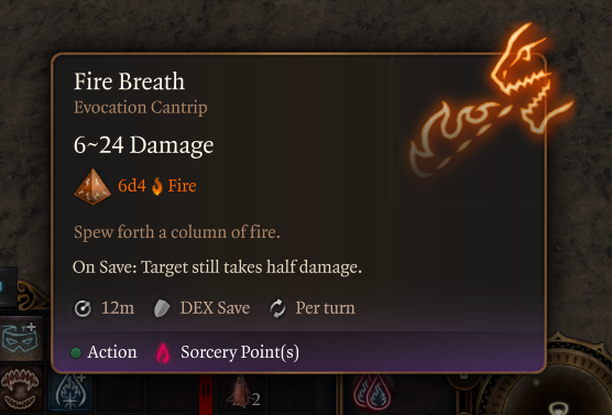 术士的冷却时间为每回合一次,但必须支付1个法术点来使用他们的吐息武器以表明这是他们龙血系谱的力量。