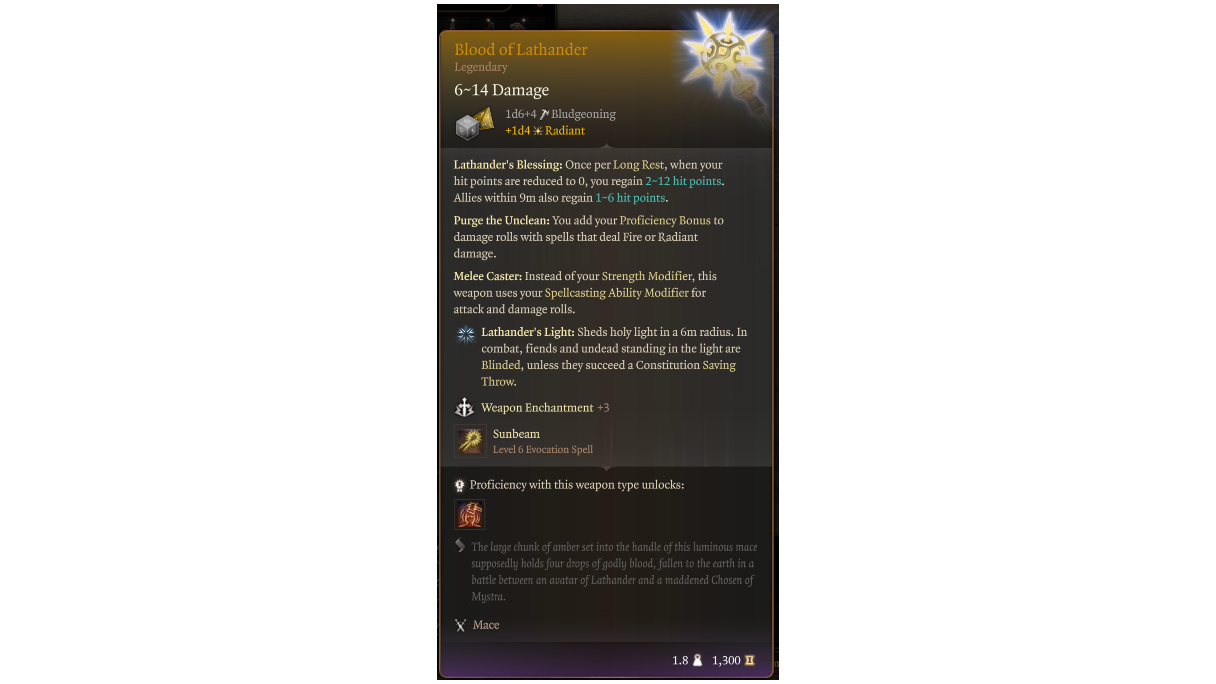 使拉撒娜德之血更具传奇色彩。现在,它会将你的熟练加值添加到所有光系和火系法术的伤害中,并在近战攻击时额外造成1d4点光系伤害。此外,在进行近战攻击和伤害掷骰时,它会使用你的施法属性而非力量。