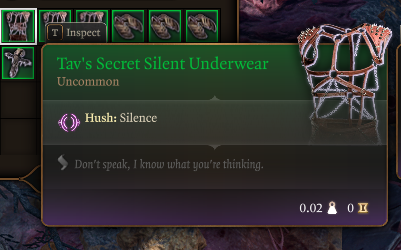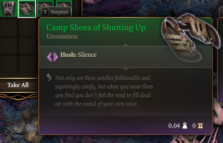 该模组提供可以切换静音咒语的装备,这样你可以让不想说话的同伴在场景中保持沉默。这对于只想听到特定台词的情况非常有用,例如你希望 Astarion 打开巨魔和食人魔所在的谷仓门,但仍然想让 Shadowheart 在场。