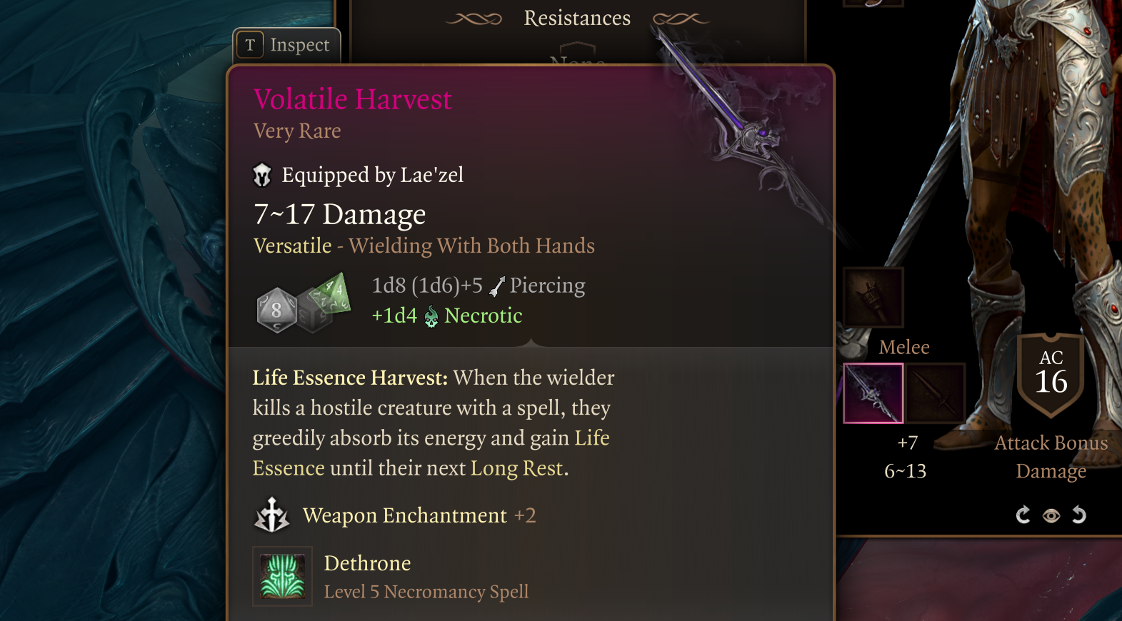 添加了一把矛,使用时会赋予你无冷却的废黜效果(仍然消耗法术位)。释放这个版本的废黜会使自己受到6d4切割伤害。这把矛可以在船教程中的宝箱中获得!计划在第二幕掉落。确实是一个强大的物品。