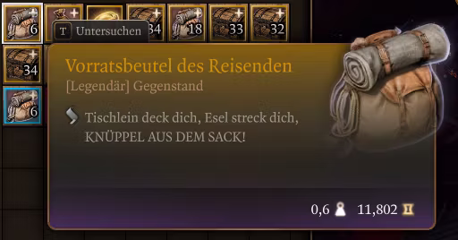 旅行者的补给袋包含了你冒险所需的一切:20个补给包、2500枚金币、一把铲子以及其他物品!这是在《博德之门3》世界中无忧无虑开始冒险的完美选择!可以在教程箱子中找到。
