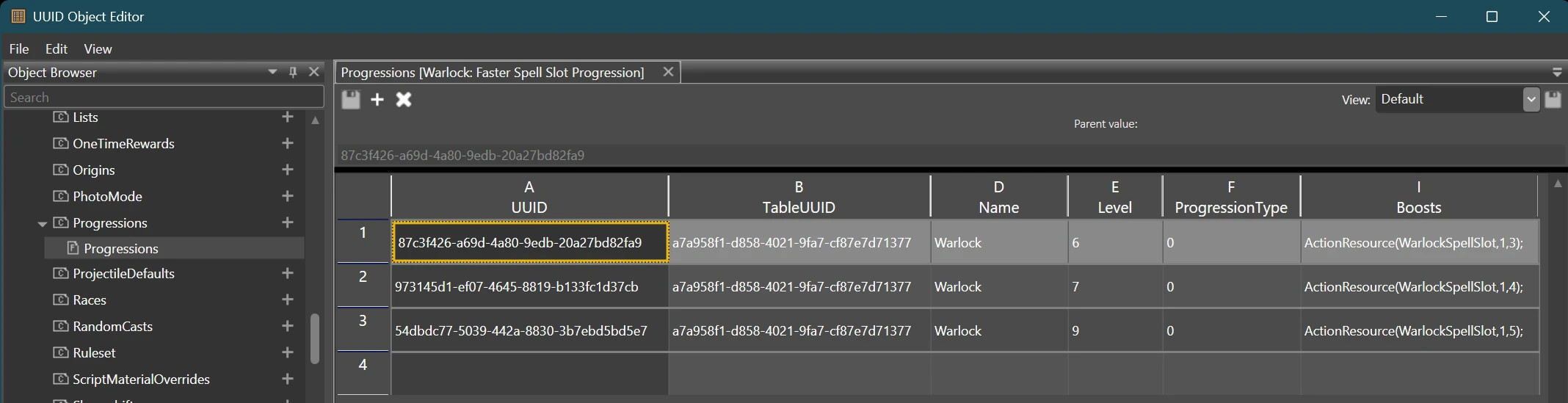 此模组向术士进度表中添加了三个新行(请参见 UUID 对象编辑器的截图)