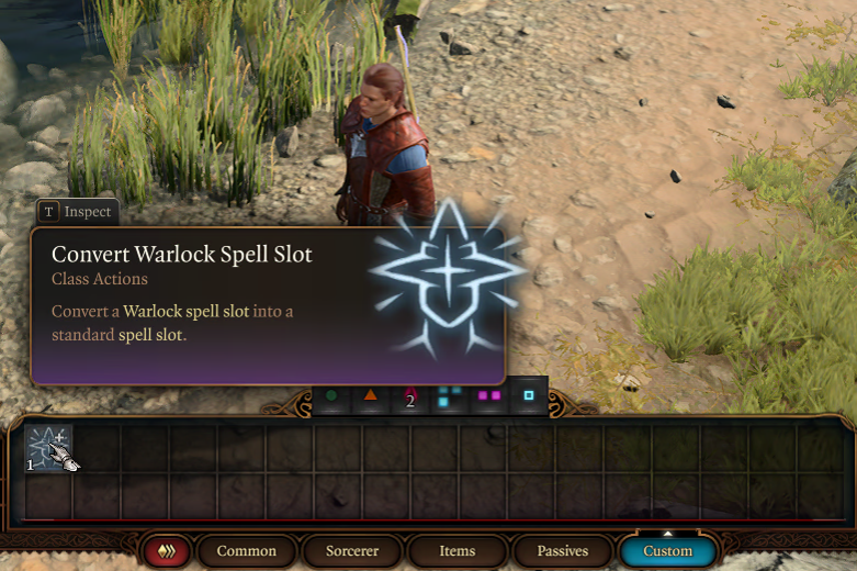 注意:为了使用“转换术士法术槽”动作,你可能需要将其拖到自定义快捷栏中。在工具包测试时,“类动作”会如预期出现在可用动作列表中;但在我的存档游戏中启用此模组后,该动作并未出现,我必须手动添加到自定义部分的快捷栏。