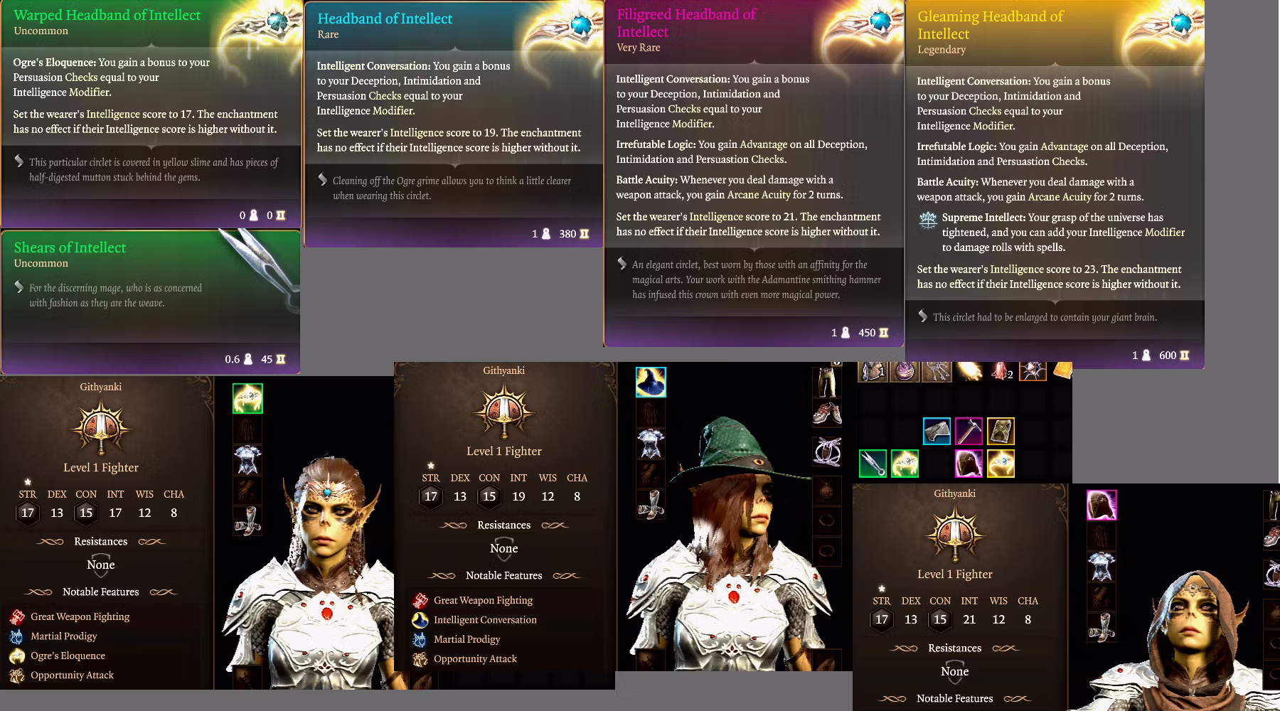 我还增加了一种类似于尖顶巫师帽的能力,可以基于你的智力修正值提升各种对话技能。基础扭曲智慧头环会为说服力提供+智力修正值的加成。稀有升级则会对所有对话技能提供+智力,并在使用法术时给予奥术协同效果。非常稀有和传奇级别的升级还会对对话技能提供优势。
