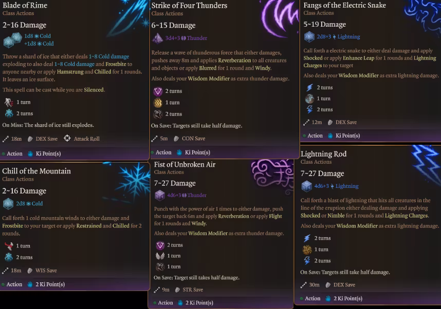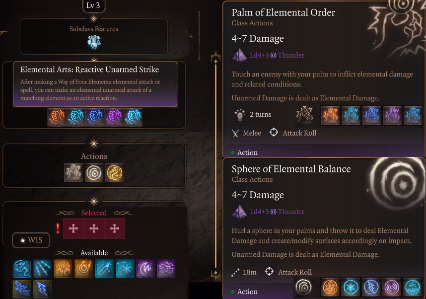 元素艺术:反应性徒手打击(在使用四元素之道的元素攻击或法术后,你可以作为一个主动反应进行一次匹配元素的徒手攻击。)(被动技能,在使用元素动作/法术时提供元素版本的徒手补击,消耗反应值)