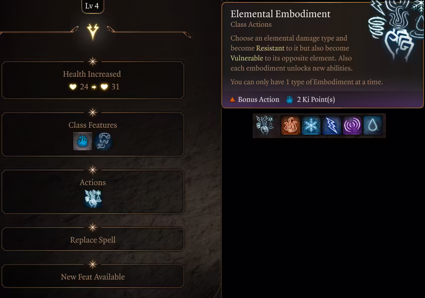 大家好,这是我的第二个模组,所以我并没有把它保持得“简单”一点,完全没有 xD。所以这个模组基本上是对四元素之道的完全重制,包括了大量的新动作、法术和工具,让元素僧侣能够使用这些来造成元素伤害、治疗、施加有用的增益/减益效果,并且让他们在游戏中感觉像真正的元素僧侣一样拥有独特的游戏体验和策略。哦对了,他们使用五种元素:火焰、寒冷、闪电、风(作为雷电)和水(作为钝击),所有内容都围绕这些“元素”展开。