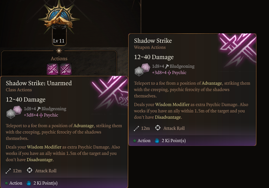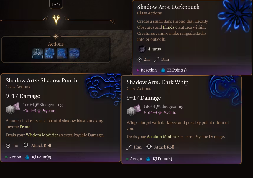 暗影打击和徒手暗影打击(改变了要求,现在与伏击攻击相同,造成你的智慧属性修正值作为心灵伤害,并且范围更大,消耗2点气力(Ki))。