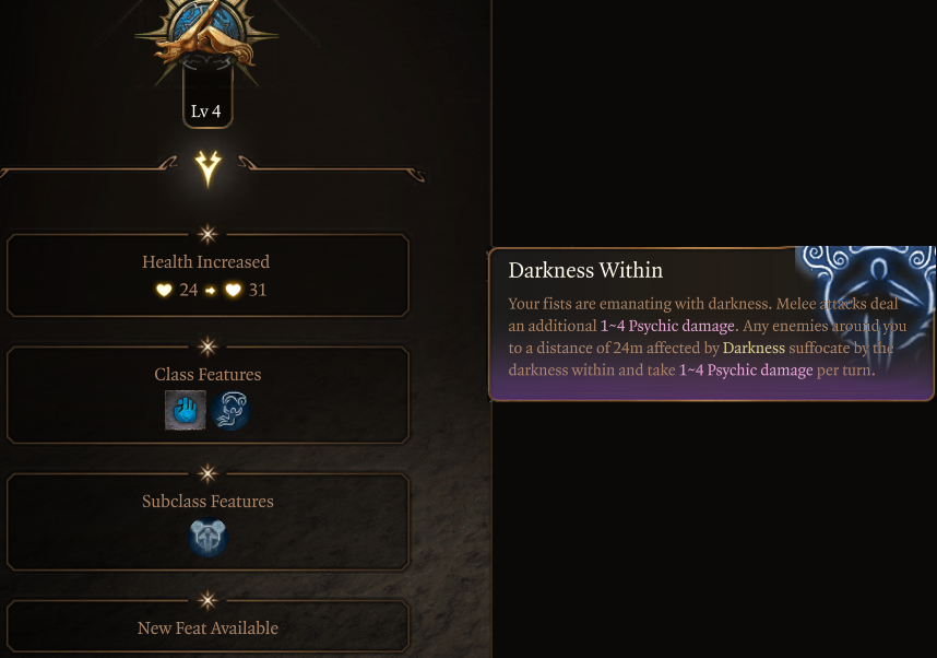 黑暗之内(一个可切换的被动技能,增加你的武器和徒手攻击额外1d4心灵伤害,并提供一个大范围区域效果,在该区域内受到黑暗影响的任何生物都会受到1d4心灵伤害。免疫黑暗的角色不受此效果的影响。)