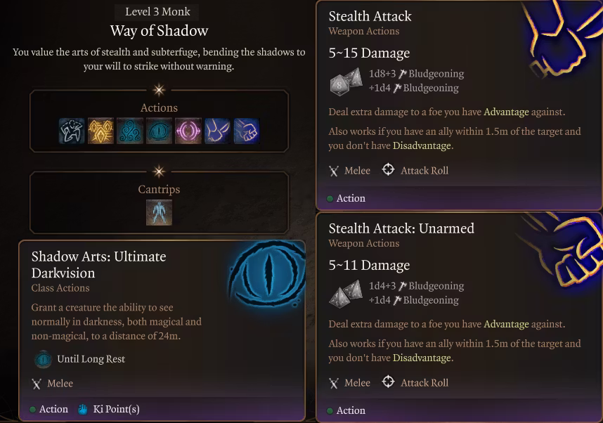 潜行攻击和徒手潜行攻击(基本上是近战伏击(+1d4每2级僧侣)的较弱版本,但主要区别在于你获得的是徒手伏击而不是远程伏击。要造成全额额外伤害,目标必须处于窒息黑暗状态,否则额外伤害减半。)