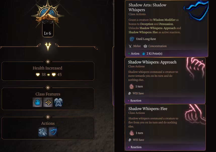 暗影技艺:暗影重击(一个锥形区域攻击,使目标倒地,消耗1点气力(Ki),造成徒手伤害加心灵伤害,并将你的智慧属性修正值加倍。)
