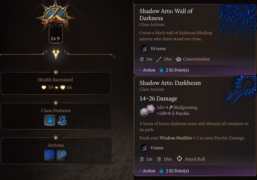 暗影技艺:暗影风暴(一个范围攻击,消耗2点气力(Ki),造成徒手伤害加心灵伤害,并将你的智慧属性修正值加倍。)